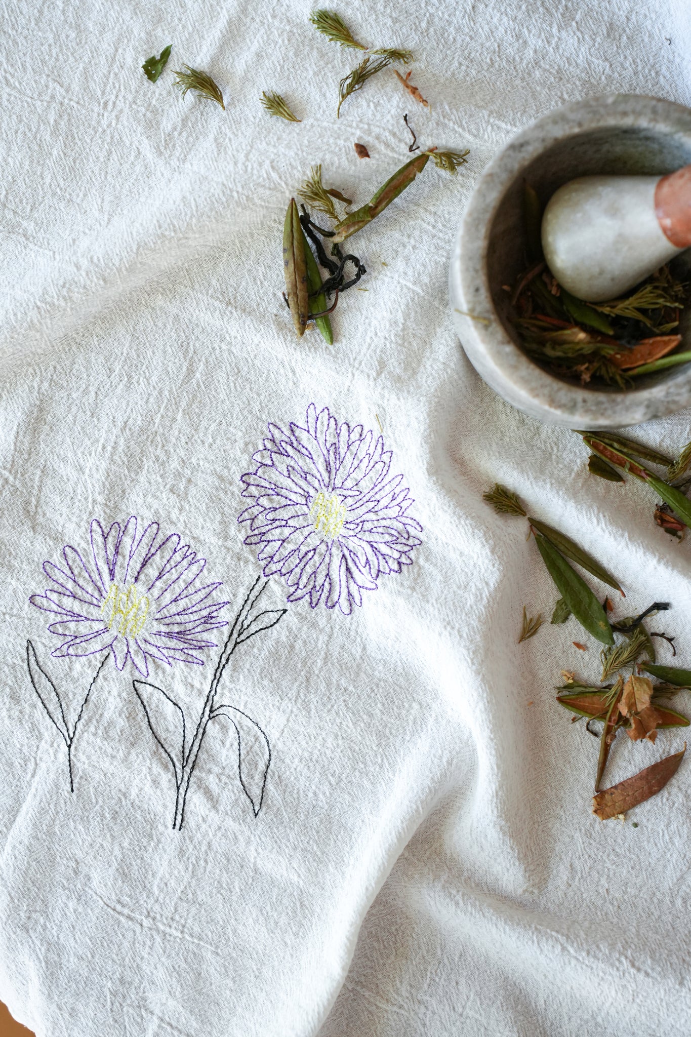 These towels are made of super absorbent, 100% cotton. Hemmed on all sides. All dish towels are designed and embroidered in the USA.
